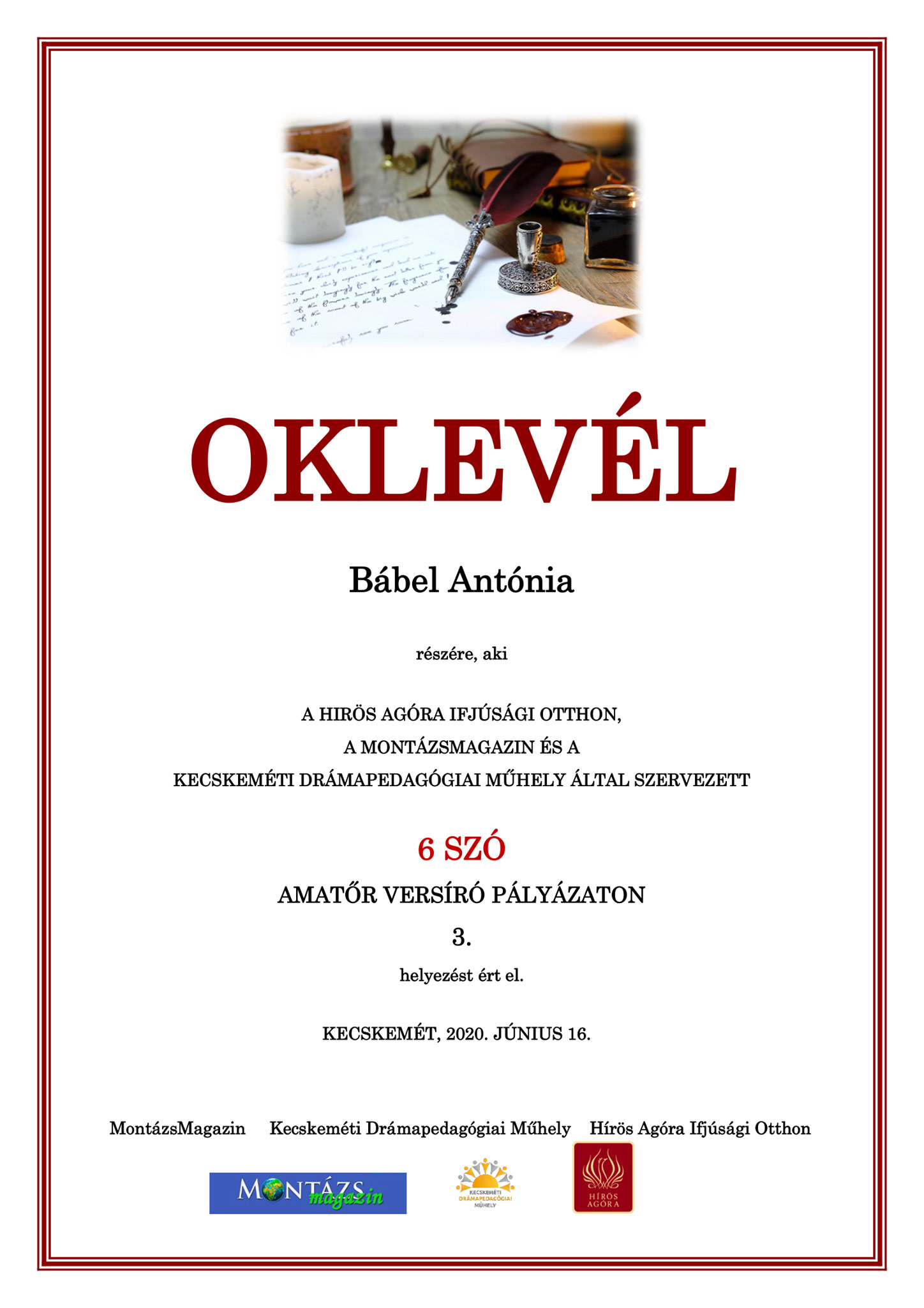 A Hírös Agóra Ifjúsági Otthon, a Montázsmagazin és a Kecskeméti Drámapedagógiai Műhely amatőr versíró pályázatot hirdetett Kecskeméten és környékén élők számára.